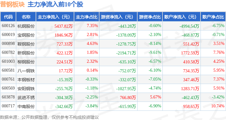 从资金流向上来看,当日普钢板块主力资金净流出2.38亿元,游资资金净流出9865.44万元,散户资金净流入3.36亿元。普钢板块个股资金流向见下表: