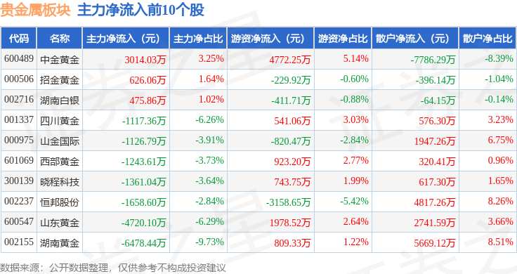 从资金流向上来看,当日贵金属板块主力资金净流出2.21亿元,游资资金净流入8025.56万元,散户资金净流入1.4亿元。贵金属板块个股资金流向见下表: