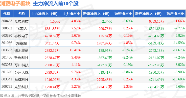 从资金流向上来看,当日消费电子板块主力资金净流出42.61亿元,游资资金净流入4.21亿元,散户资金净流入38.4亿元。消费电子板块个股资金流向见下表:
