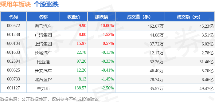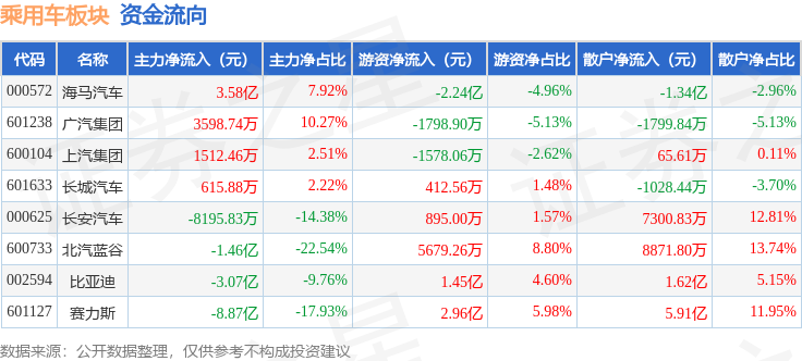 从资金流向上来看,当日乘用车板块主力资金净流出10.06亿元,游资资金净流入2.52亿元,散户资金净流入7.54亿元。乘用车板块个股资金流向见下表: