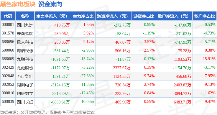 从资金流向上来看,当日黑色家电板块主力资金净流出1.68亿元,游资资金净流入5442.77万元,散户资金净流入1.13亿元。黑色家电板块个股资金流向见下表: