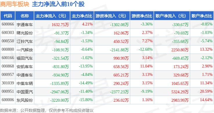 从资金流向上来看,当日商用车板块主力资金净流出3.39亿元,游资资金净流入5298.81万元,散户资金净流入2.86亿元。商用车板块个股资金流向见下表:
