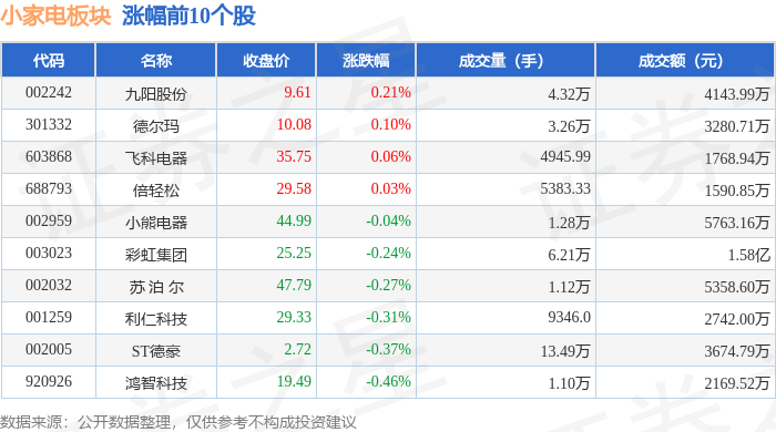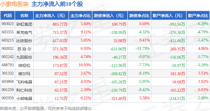 从资金流向上来看,当日小家电板块主力资金净流出1.67亿元,游资资金净流入7946.98万元,散户资金净流入8745.2万元。小家电板块个股资金流向见下表: