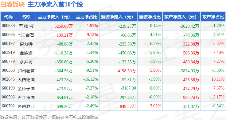 从资金流向上来看,当日白酒板块主力资金净流出3.76亿元,游资资金净流入1.79亿元,散户资金净流入1.97亿元。白酒板块个股资金流向见下表: