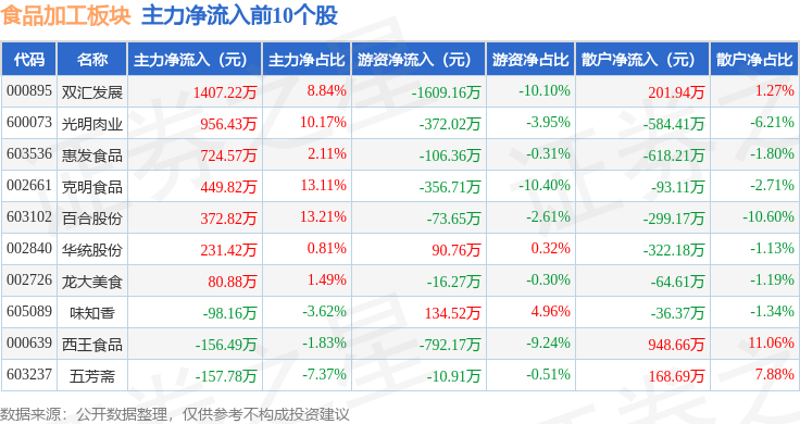 从资金流向上来看,当日食品加工板块主力资金净流出1.76亿元,游资资金净流入2106.79万元,散户资金净流入1.55亿元。食品加工板块个股资金流向见下表: