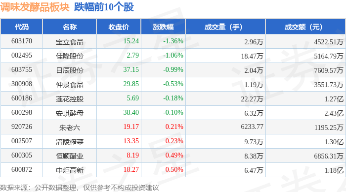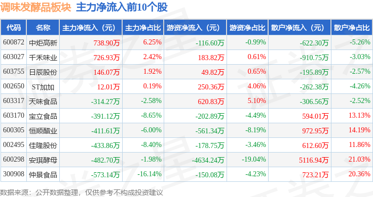 从资金流向上来看,当日调味发酵品板块主力资金净流出7519.36万元,游资资金净流出2330.07万元,散户资金净流入9849.43万元。调味发酵品板块个股资金流向见下表: