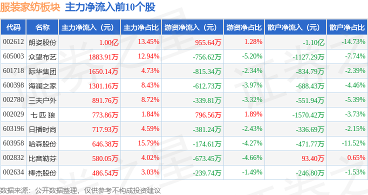 从资金流向上来看,当日服装家纺板块主力资金净流出1.28亿元,游资资金净流入94.15万元,散户资金净流入1.27亿元。服装家纺板块个股资金流向见下表: