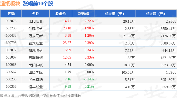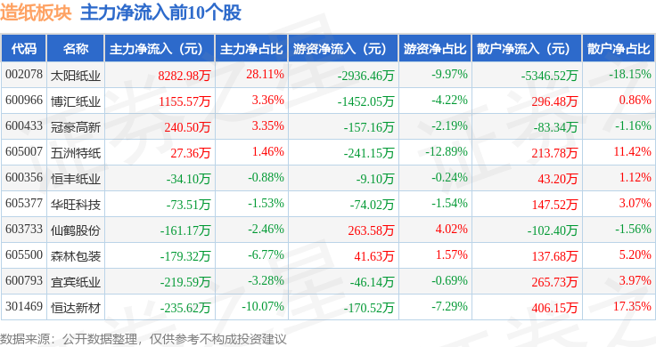 从资金流向上来看,当日造纸板块主力资金净流出1.56亿元,游资资金净流出5872.82万元,散户资金净流入2.15亿元。造纸板块个股资金流向见下表: