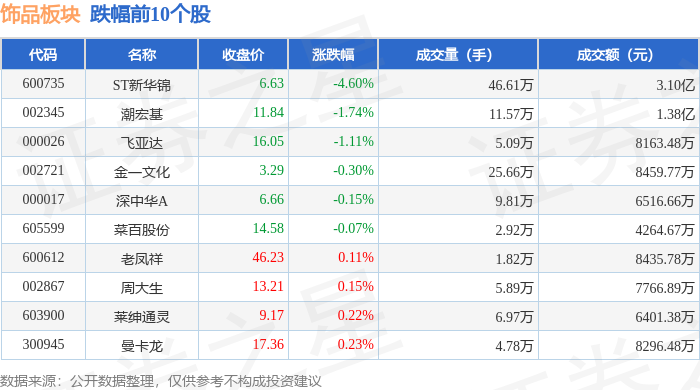 从资金流向上来看,当日饰品板块主力资金净流出3677.61万元,游资资金净流入1068.39万元,散户资金净流入2609.23万元。饰品板块个股资金流向见下表: