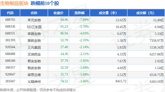 证券之星消息,11月7日生物制品板块较上一交易日下跌0.37%,禾元生物领跌。当日上证指数报收于3997.56,下跌0.25%。深证成指报收于13404.06,下跌0.36%。生物制品板块个股涨跌见下表: