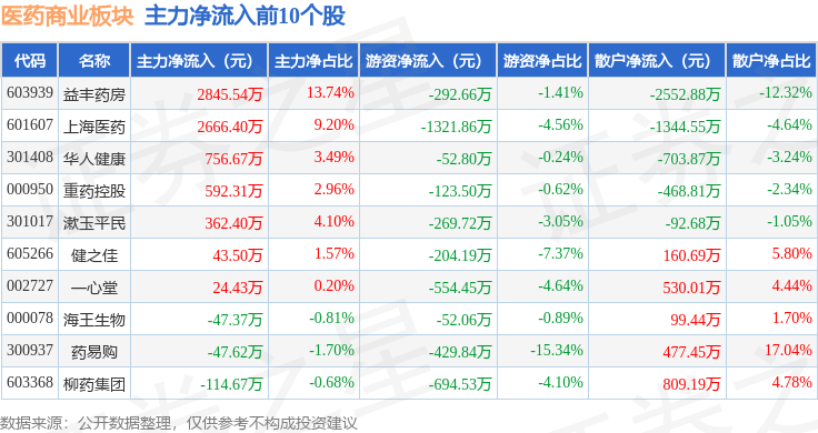 从资金流向上来看,当日医药商业板块主力资金净流出2.69亿元,游资资金净流入1351.23万元,散户资金净流入2.56亿元。医药商业板块个股资金流向见下表:
