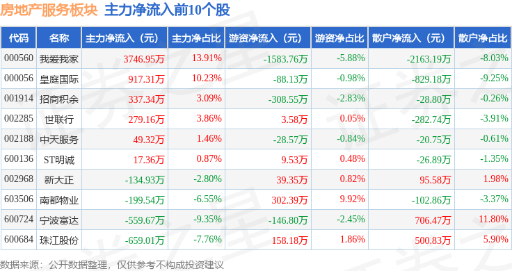 从资金流向上来看,当日房地产服务板块主力资金净流入2316.85万元,游资资金净流出957.66万元,散户资金净流出1359.18万元。房地产服务板块个股资金流向见下表: