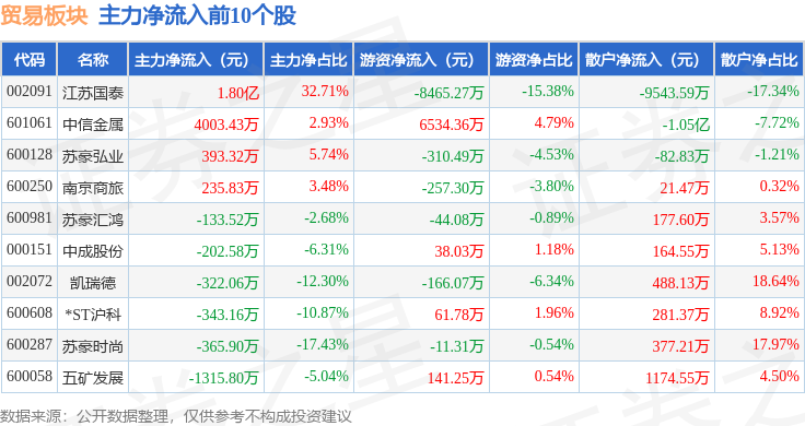 从资金流向上来看,当日贸易板块主力资金净流入1.31亿元,游资资金净流出3496.02万元,散户资金净流出9562.41万元。贸易板块个股资金流向见下表: