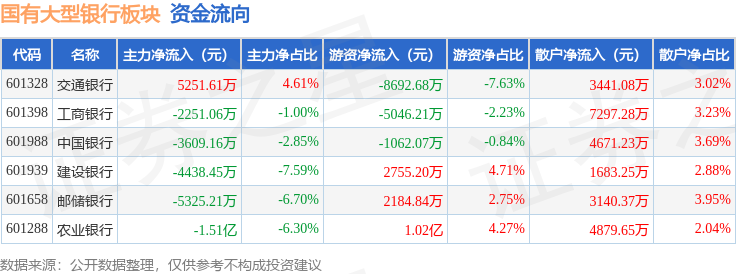 从资金流向上来看,当日国有大型银行板块主力资金净流出2.55亿元,游资资金净流入374.67万元,散户资金净流入2.51亿元。国有大型银行板块个股资金流向见下表:
