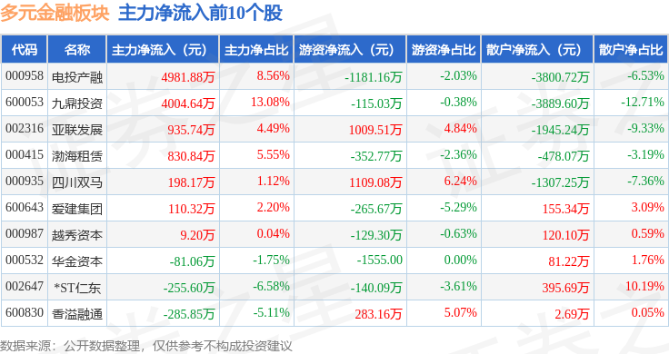 从资金流向上来看,当日多元金融板块主力资金净流出4.3亿元,游资资金净流入8425.13万元,散户资金净流入3.46亿元。多元金融板块个股资金流向见下表: