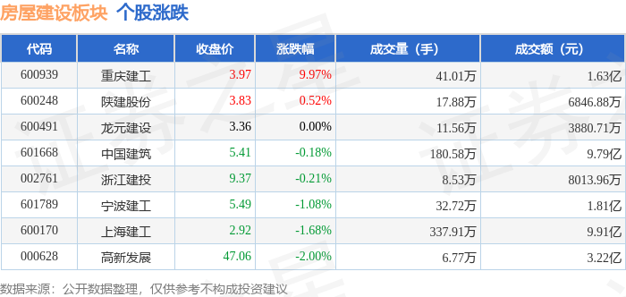 从资金流向上来看,当日房屋建设板块主力资金净流出2.69亿元,游资资金净流入1.01亿元,散户资金净流入1.68亿元。房屋建设板块个股资金流向见下表: