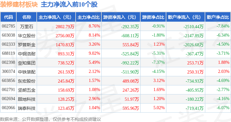 从资金流向上来看,当日装修建材板块主力资金净流出2.11亿元,游资资金净流入5187.18万元,散户资金净流入1.59亿元。装修建材板块个股资金流向见下表: