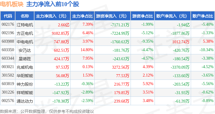 从资金流向上来看,当日电机板块主力资金净流出5.68亿元,游资资金净流入1.67亿元,散户资金净流入4.01亿元。电机板块个股资金流向见下表: