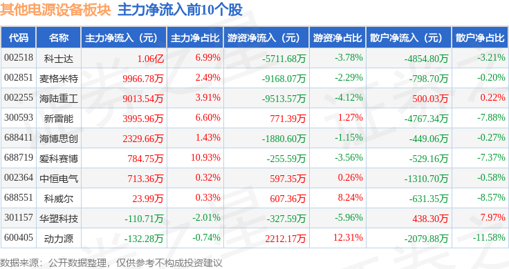 从资金流向上来看,当日其他电源设备板块主力资金净流出10.86亿元,游资资金净流入533.69万元,散户资金净流入10.81亿元。其他电源设备板块个股资金流向见下表: