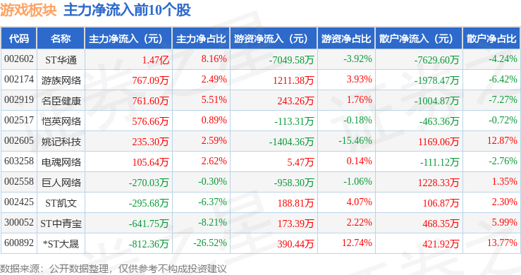 从资金流向上来看,当日游戏板块主力资金净流出9.99亿元,游资资金净流入2.39亿元,散户资金净流入7.6亿元。游戏板块个股资金流向见下表: