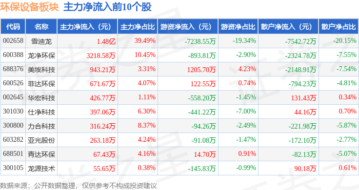 从资金流向上来看,当日环保设备板块主力资金净流入1.36亿元,游资资金净流出6273.84万元,散户资金净流出7334.63万元。环保设备板块个股资金流向见下表: