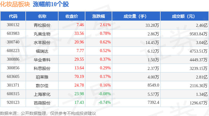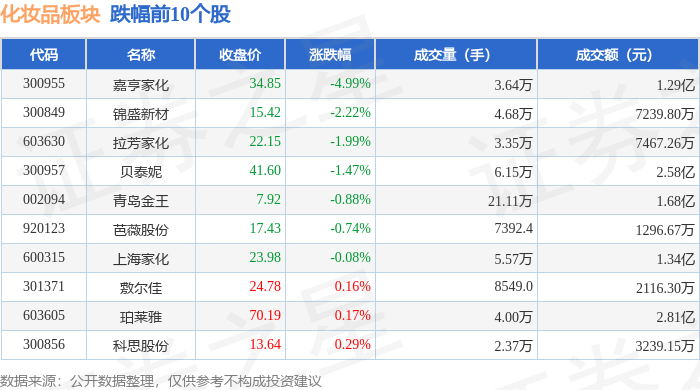 证券之星消息,11月7日化妆品板块较上一交易日下跌0.24%,嘉亨家化领跌。当日上证指数报收于3997.56,下跌0.25%。深证成指报收于13404.06,下跌0.36%。化妆品板块个股涨跌见下表: