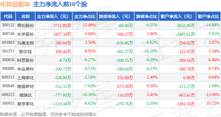 从资金流向上来看,当日化妆品板块主力资金净流出4389.4万元,游资资金净流入3010.26万元,散户资金净流入1379.14万元。化妆品板块个股资金流向见下表: