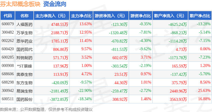 从资金流向上来看,当日芬太尼概念板块主力资金净流入3878.32万元,游资资金净流出2510.35万元,散户资金净流出1367.96万元。芬太尼概念板块个股资金流向见下表: