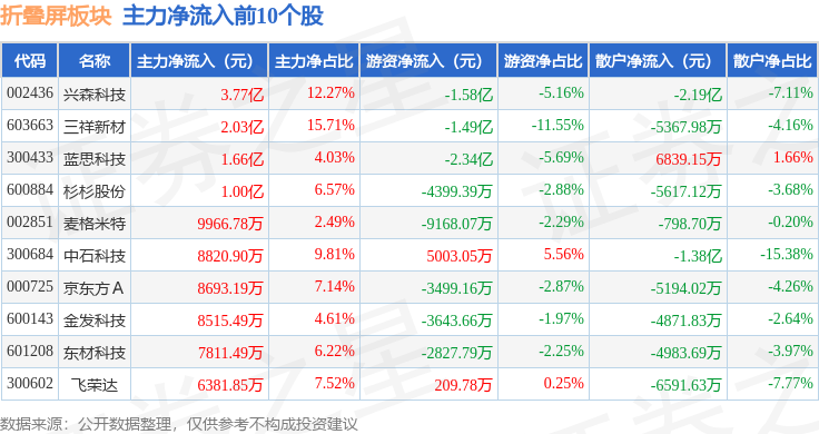 从资金流向上来看,当日折叠屏板块主力资金净流出3.73亿元,游资资金净流出6.9亿元,散户资金净流入10.63亿元。折叠屏板块个股资金流向见下表: