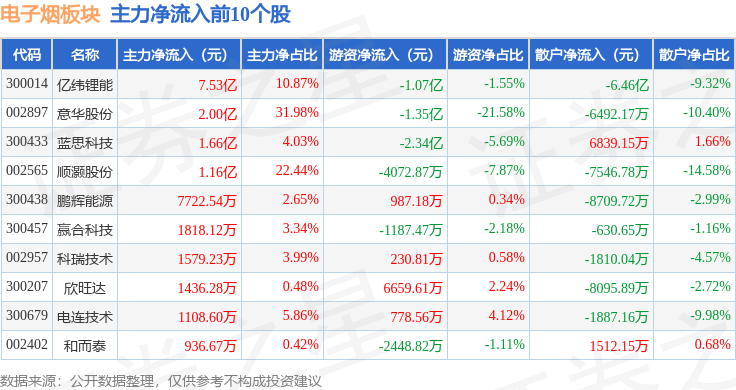 从资金流向上来看,当日电子烟板块主力资金净流入2367.88万元,游资资金净流出4.65亿元,散户资金净流入4.42亿元。电子烟板块个股资金流向见下表: