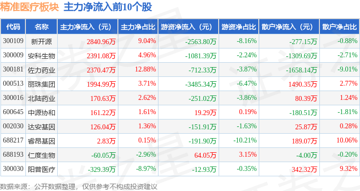 从资金流向上来看,当日精准医疗板块主力资金净流出1.96亿元,游资资金净流出5523.32万元,散户资金净流入2.51亿元。精准医疗板块个股资金流向见下表: