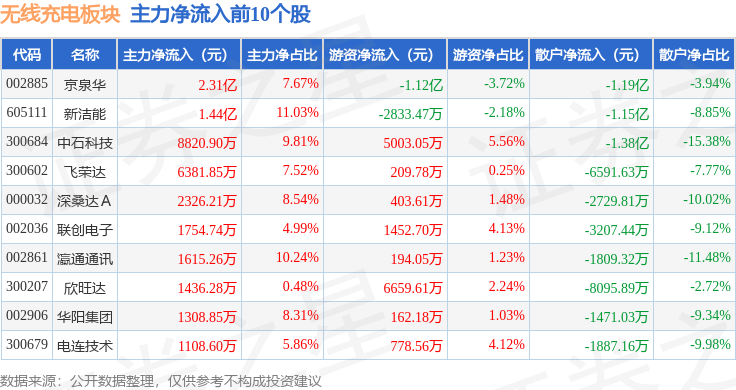 从资金流向上来看,当日无线充电板块主力资金净流出19.84亿元,游资资金净流入1.86亿元,散户资金净流入17.98亿元。无线充电板块个股资金流向见下表: