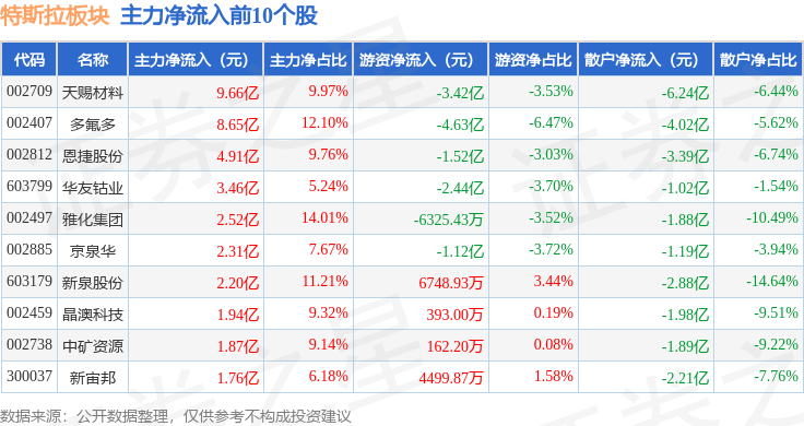从资金流向上来看,当日特斯拉板块主力资金净流出17.67亿元,游资资金净流入7.11亿元,散户资金净流入10.56亿元。特斯拉板块个股资金流向见下表: