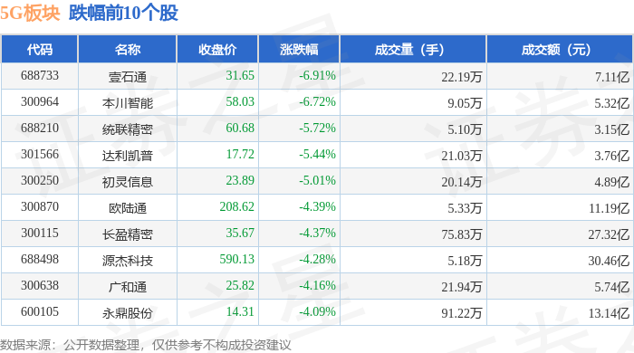证券之星消息,11月7日5G板块较上一交易日下跌0.43%,壹石通领跌。当日上证指数报收于3997.56,下跌0.25%。深证成指报收于13404.06,下跌0.36%。5G板块个股涨跌见下表: