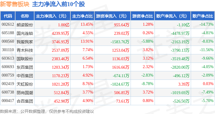 从资金流向上来看,当日新零售板块主力资金净流出4.29亿元,游资资金净流入2662.0万元,散户资金净流入4.02亿元。新零售板块个股资金流向见下表: