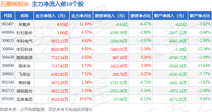 从资金流向上来看,当日石墨烯板块主力资金净流入1.94亿元,游资资金净流出3.33亿元,散户资金净流入1.39亿元。石墨烯板块个股资金流向见下表: