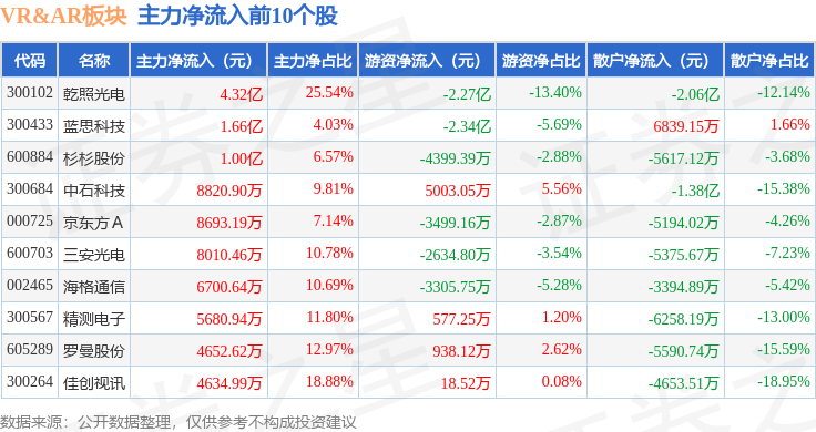 从资金流向上来看,当日VR&AR板块主力资金净流出66.19亿元,游资资金净流入12.95亿元,散户资金净流入53.24亿元。VR&AR板块个股资金流向见下表: