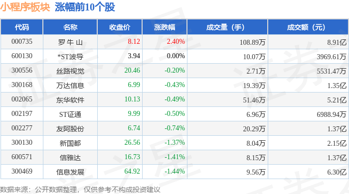 从资金流向上来看,当日小程序板块主力资金净流出3.3亿元,游资资金净流出6605.23万元,散户资金净流入3.96亿元。小程序板块个股资金流向见下表: