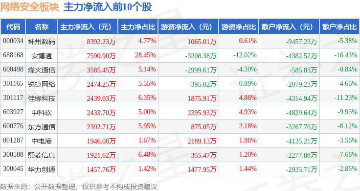 从资金流向上来看,当日网络安全板块主力资金净流出59.18亿元,游资资金净流入13.06亿元,散户资金净流入46.12亿元。网络安全板块个股资金流向见下表:
