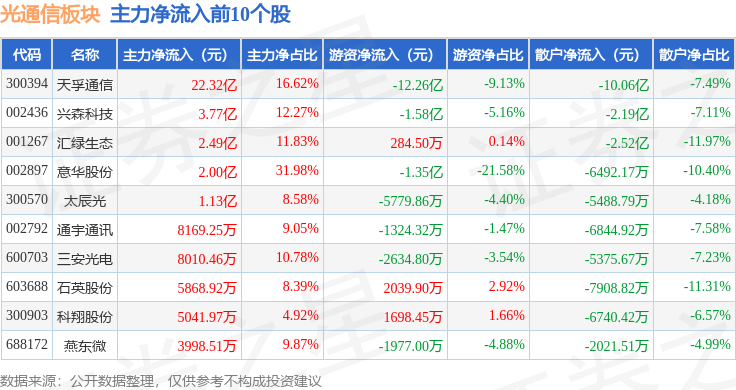 从资金流向上来看,当日光通信板块主力资金净流出22.1亿元,游资资金净流出2.06亿元,散户资金净流入24.17亿元。光通信板块个股资金流向见下表: