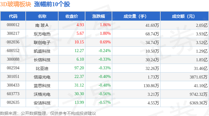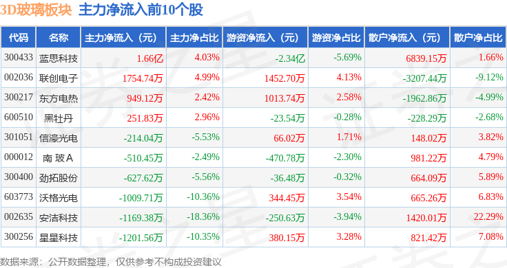 从资金流向上来看,当日3D玻璃板块主力资金净流出7.43亿元,游资资金净流出7947.42万元,散户资金净流入8.23亿元。3D玻璃板块个股资金流向见下表: