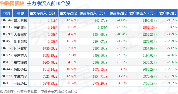从资金流向上来看,当日物联网板块主力资金净流出97.99亿元,游资资金净流入19.19亿元,散户资金净流入78.8亿元。物联网板块个股资金流向见下表: