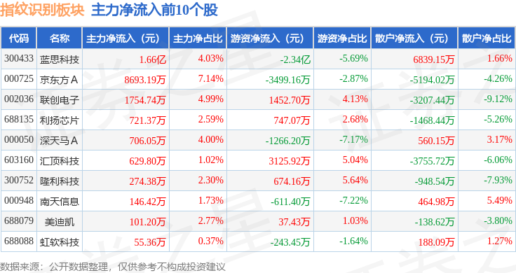 从资金流向上来看,当日指纹识别板块主力资金净流出7.62亿元,游资资金净流入2195.06万元,散户资金净流入7.4亿元。指纹识别板块个股资金流向见下表: