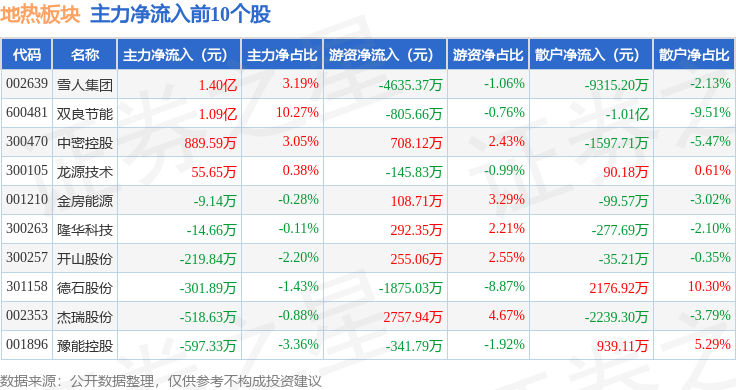 从资金流向上来看,当日地热板块主力资金净流出3958.36万元,游资资金净流出1637.24万元,散户资金净流入5595.6万元。地热板块个股资金流向见下表: