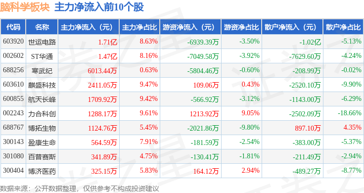 从资金流向上来看,当日脑科学板块主力资金净流出9.7亿元,游资资金净流入1.09亿元,散户资金净流入8.61亿元。脑科学板块个股资金流向见下表: