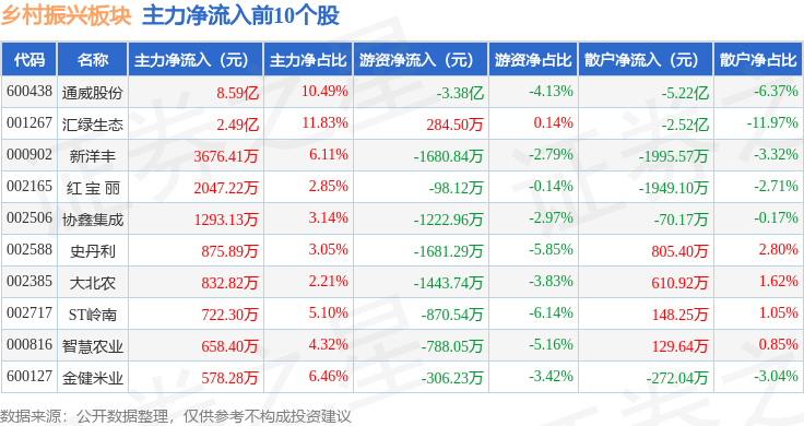 从资金流向上来看,当日乡村振兴板块主力资金净流入4.46亿元,游资资金净流出3.43亿元,散户资金净流出1.03亿元。乡村振兴板块个股资金流向见下表: