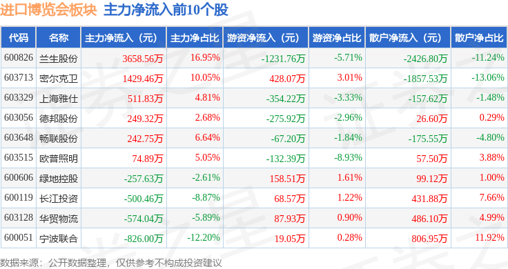 从资金流向上来看,当日进口博览会板块主力资金净流出4421.14万元,游资资金净流入82.73万元,散户资金净流入4338.41万元。进口博览会板块个股资金流向见下表: