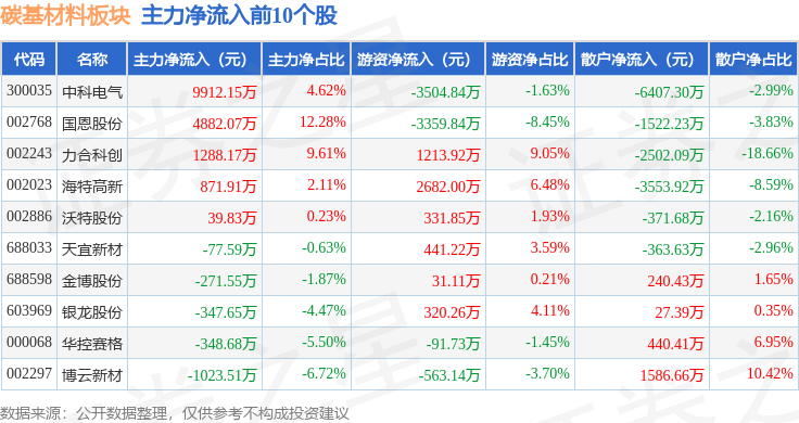 从资金流向上来看,当日碳基材料板块主力资金净流出3.15亿元,游资资金净流入7307.44万元,散户资金净流入2.42亿元。碳基材料板块个股资金流向见下表: