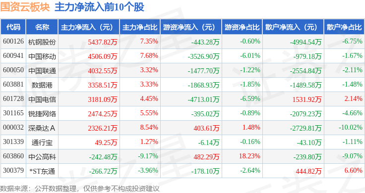 从资金流向上来看,当日国资云板块主力资金净流出22.93亿元,游资资金净流入5.0亿元,散户资金净流入17.93亿元。国资云板块个股资金流向见下表: