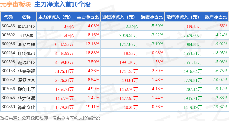 从资金流向上来看,当日元宇宙板块主力资金净流出39.87亿元,游资资金净流入6.92亿元,散户资金净流入32.95亿元。元宇宙板块个股资金流向见下表: